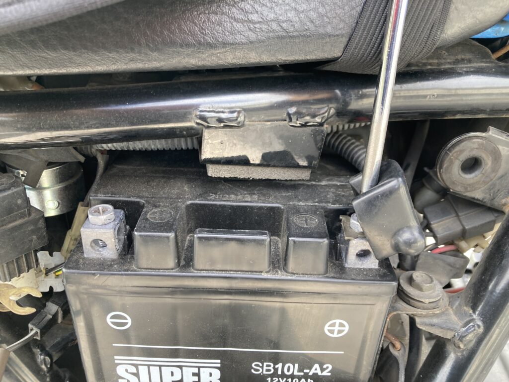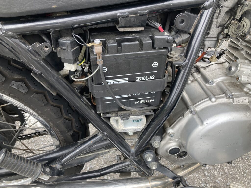 実は、グラストラッカーのバッテリーケースのサイズは初期型・後期型ともに共通です。後期型では、開放型バッテリーから密閉型(MF)バッテリーへと変更され、それに伴ってバッテリー本体のサイズも小型化されています。容量も11Ahから6Ahへとダウンしています。