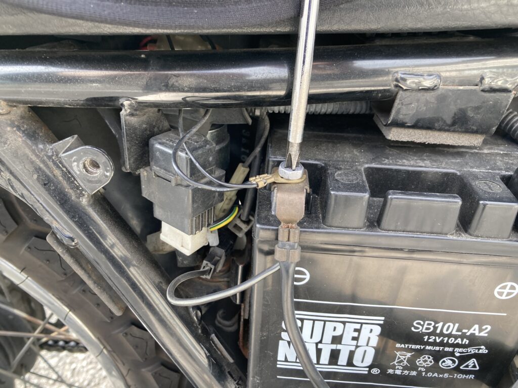 - まずマイナス側の配線をボルトから外します