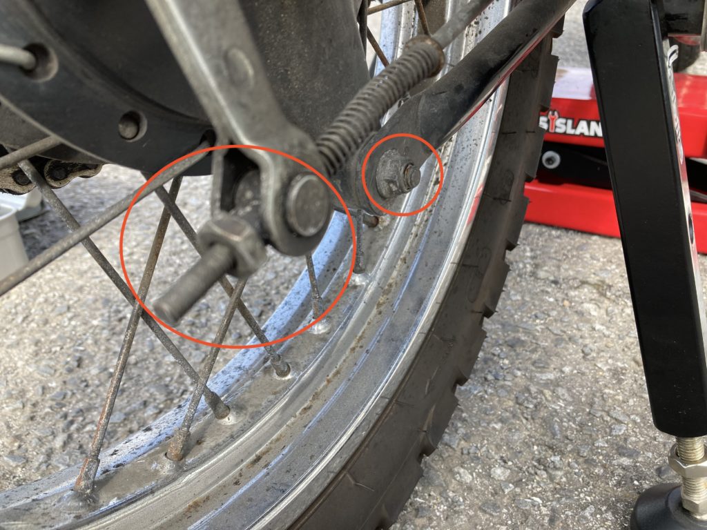 まず、リアブレーキロッドを外します。ブレーキロッドを外すことで、後輪を取り外す際の干渉を防ぎます。