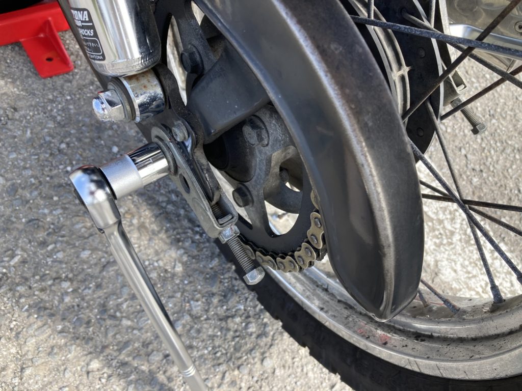 取り外しと逆の手順でホイールを車体に戻します。チェーンを正しくかけ、チェーンの張りを調整してから、アクスルナットを締め付けます。