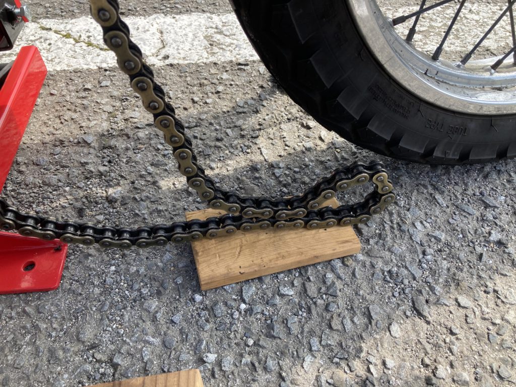 チェーンが汚れないよう、吊るすか地面に木板を敷くと便利です。作業スペースを汚さずに済みます。