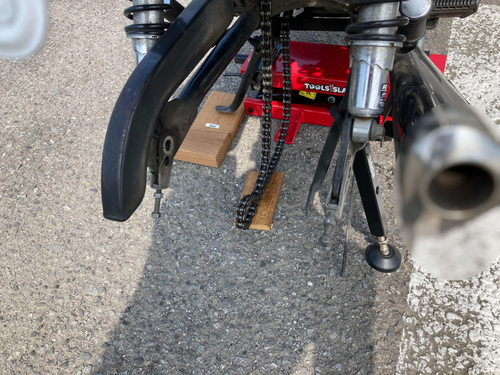 ジャッキアップしてバイクを安定させます。今回は両ステップの2点をジャッキで支え、後輪を浮かせる方法で作業しました。この方法でバイクがしっかり安定するため、リアタイヤの取り外し作業も安心して行えます。