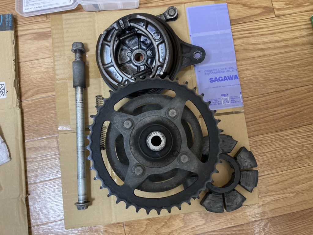 ブレーキシューカバーやリアスプロケットはフリーの状態になるため、落とさないよう注意してください。小さな部品をなくさないよう、トレーや布の上で作業すると安全です。