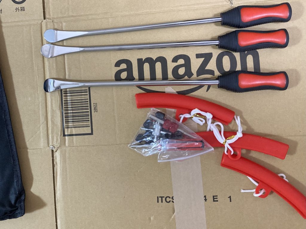 今回のタイヤ交換では、Amazonで購入したタイヤレバーセットを使用しました。セットにはタイヤレバーのほか、リムプロテクターや虫回しなど、タイヤ交換に必要なアイテムが一通り揃っています。