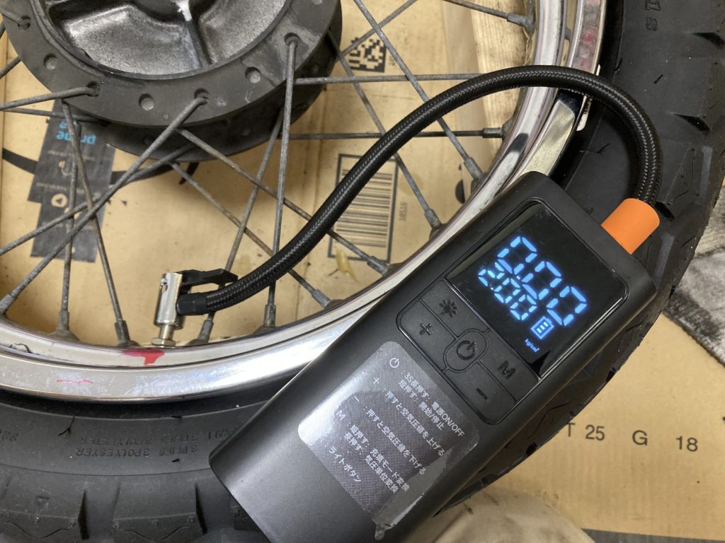 タイヤに空気を入れる際には、コンプレッサーが必要です。私が使用しているのはモバイルコンプレッサーで、バイクだけでなく、車や自転車にも使える便利アイテムです。