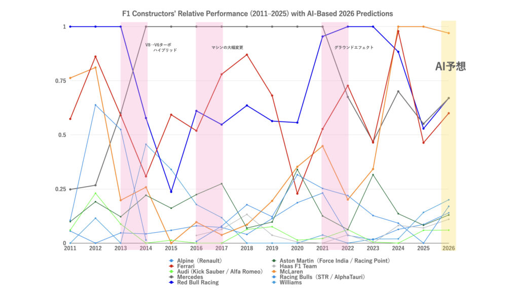 今回の記事では、そうしたすべてを網羅するのではなく、過去のコンストラクターズポイントとパワーユニット情報をもとに、AIを使ってシンプルに勢力図を予測してみました。専門的な未来予測というよりも、「データから見た場合、2026年はどう見えるのか」を一つの視点として提示しています。