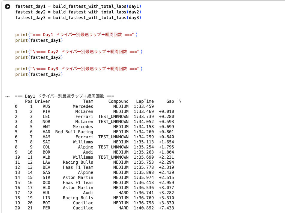 ブラウザで手軽に使えるF1Dashに対し、FastF1は「自分で分析する」ためのツールです。プログラミングの基礎知識は必要になりますが、その分、自由度は非常に高く、思い通りの視点でレースを掘り下げることができます。