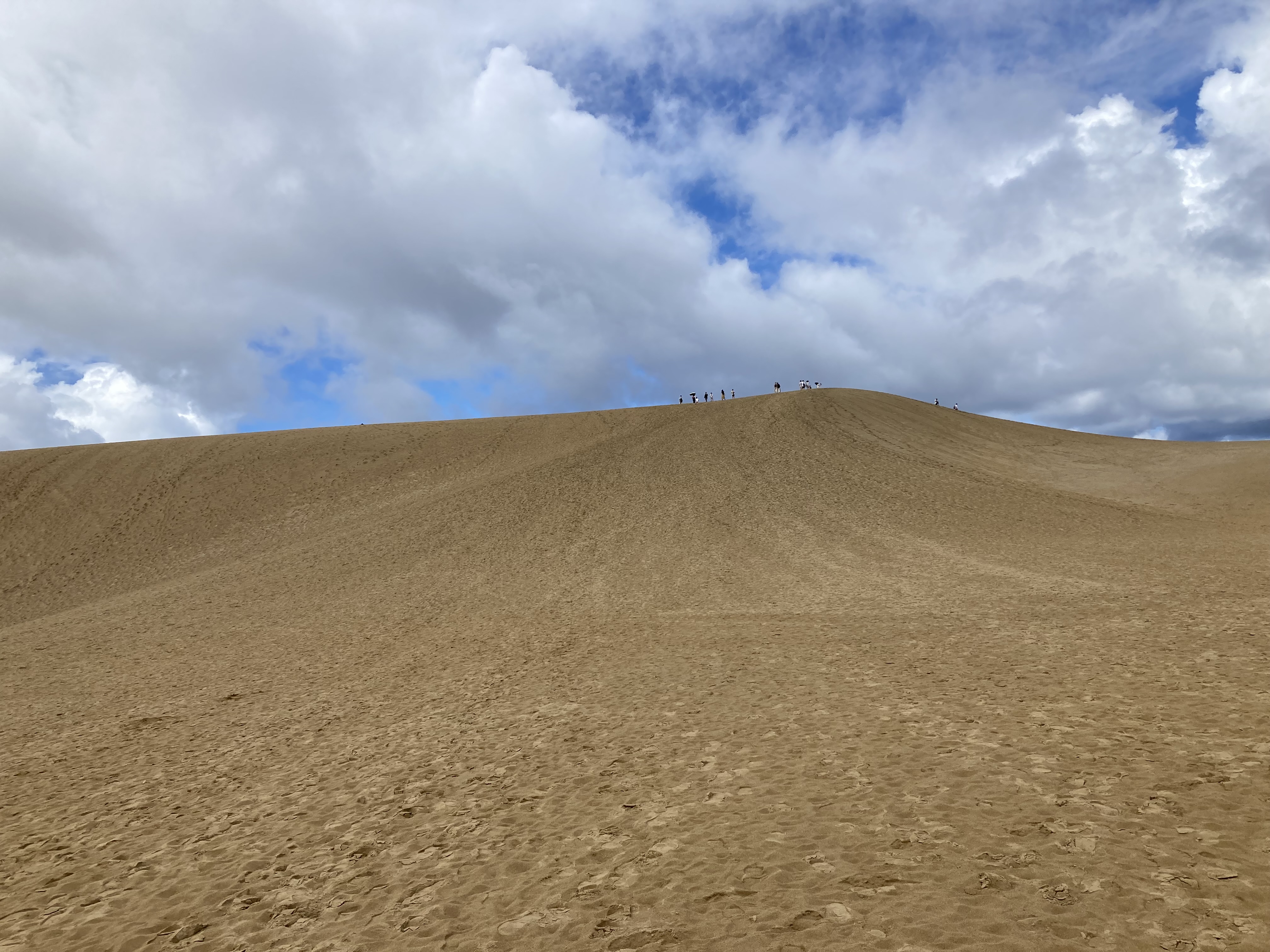鳥取砂丘のシンボル「馬の背」に登ると、日本海を一望できる大パノラマが広がり、達成感も抜群です。